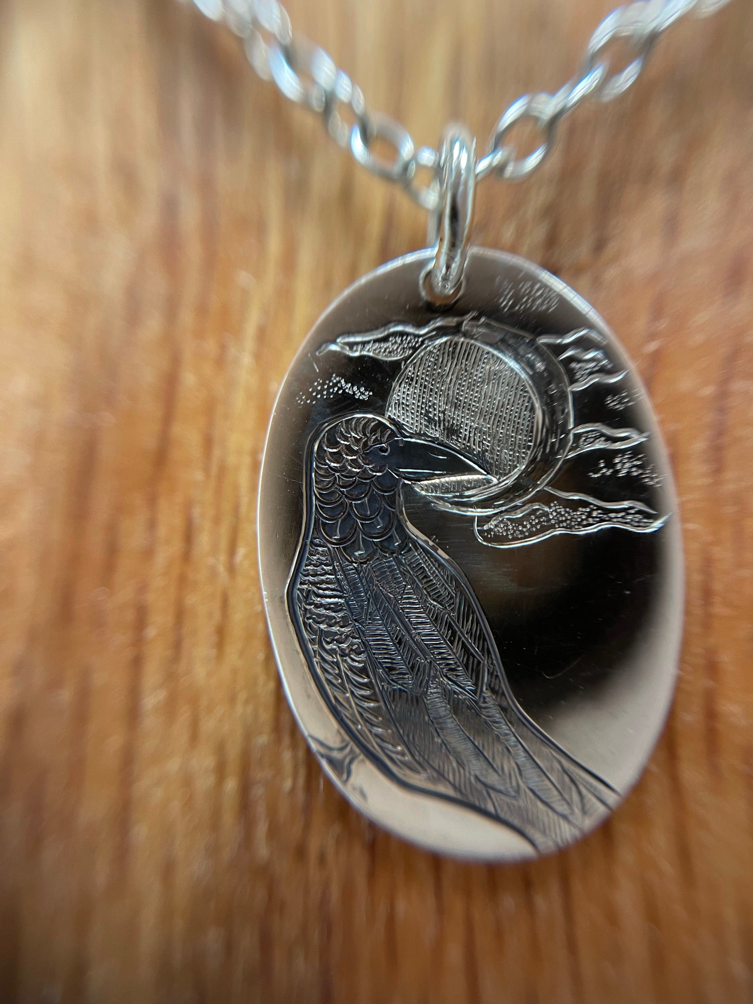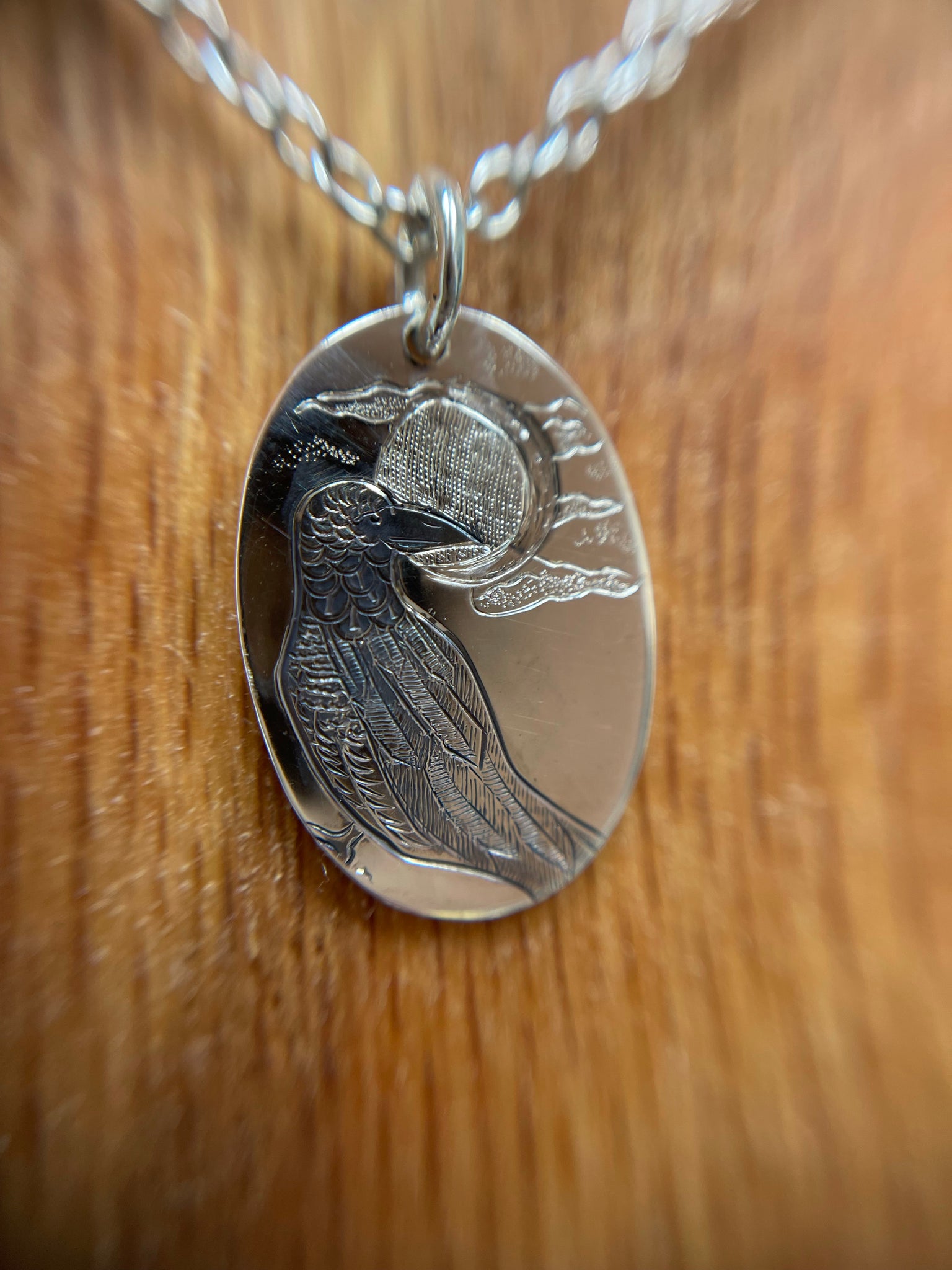 Made from recycled sterling silver this pendant is a small oval that is hand engraved with an oxidized raven with highly detailed feather patterns and in the background a misty cloudy moon. It is sweet & atmospheric. It’s beautiful worn alone or in a layered neck mess.