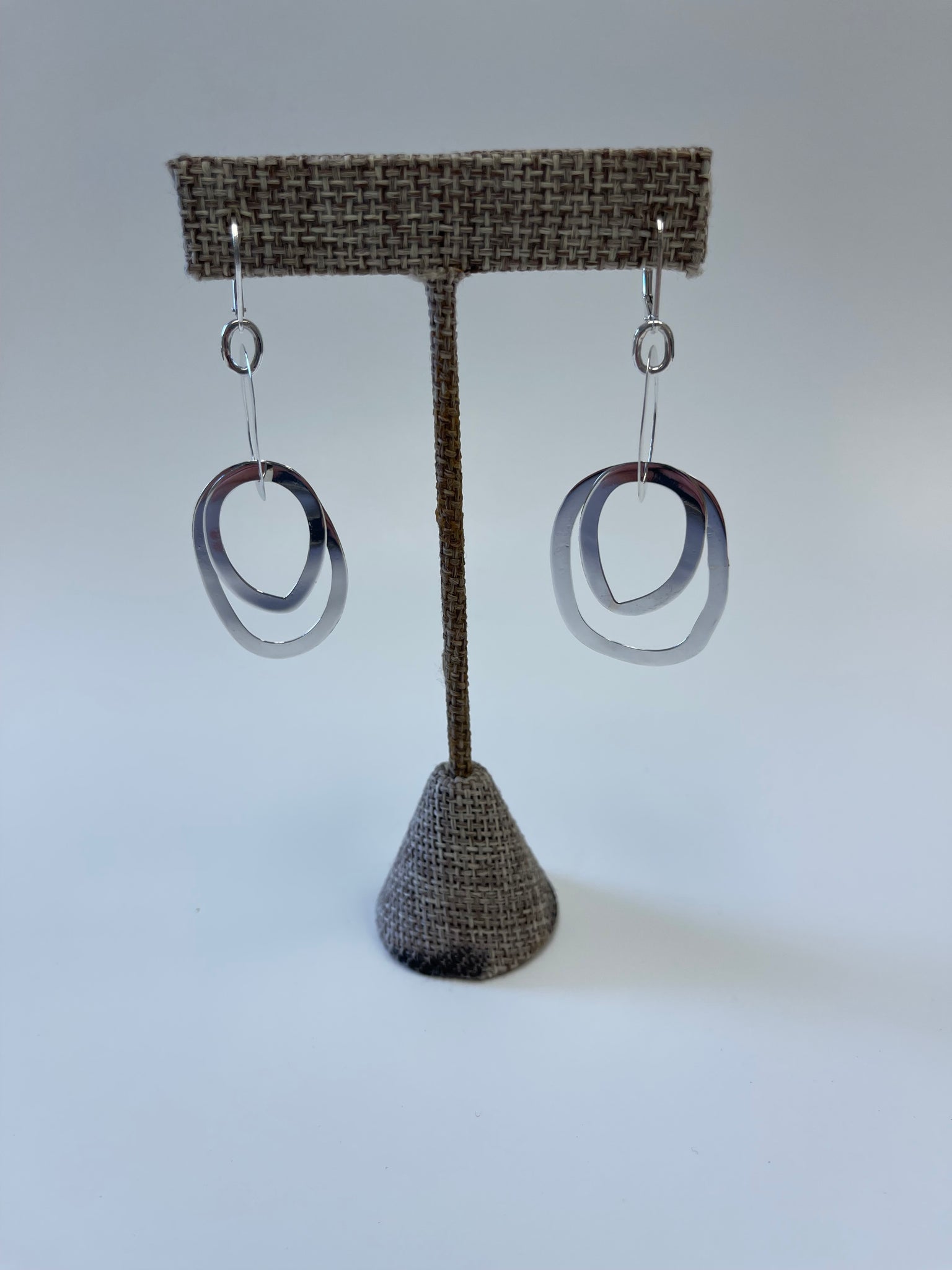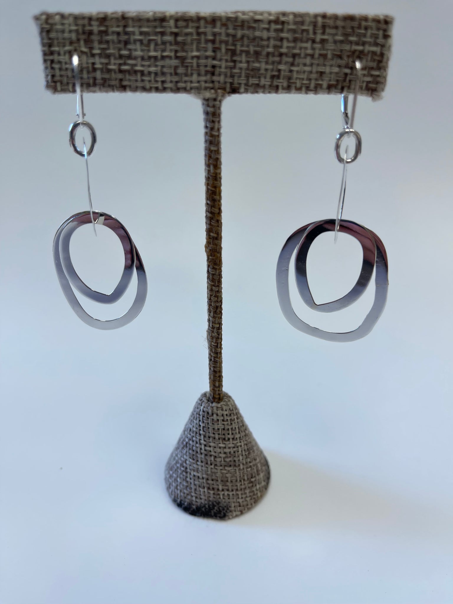 These unique earrings measure 2.5" from top to bottom. All the rings are free moving so these dangle with a lot of life and movement to them. They have a very reflective polish to them so there is a lot of shine and shimmer as well. Of course, these are made from sterling silver, and they will tarnish if you want them to. They are very lightweight and comfortable to wear. they dangle from a lever back style ear wire which is very secure. Like all my work, these earrings are made of over 80% recycled precious metals for an eco-kinder approach to the fine art of personal adornment.